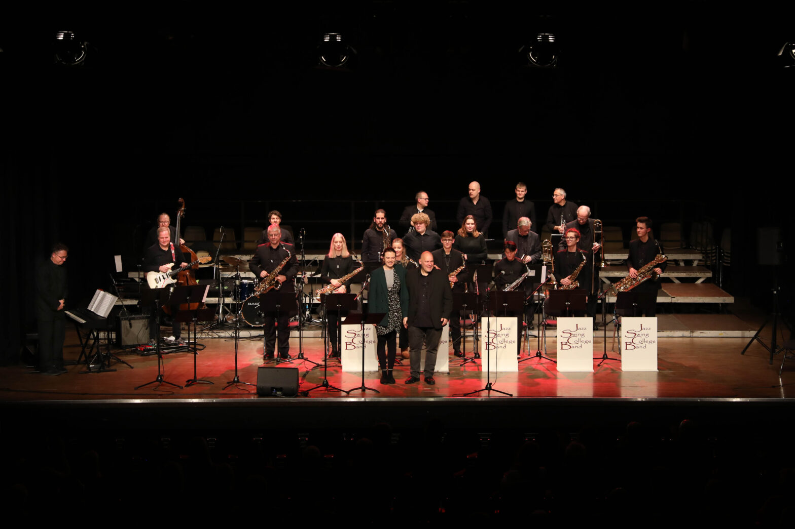 Zunächst ging es instrumental weiter mit der Jazz Swing College Band unter ihrem Leiter Oliver Hirschegger. Nach einer behutsamen Einführung durch „Silent Night“ wurde es im Orchestersaal der Musikschule schnell beinahe ausgelassen mit „Jingle Bells“ in einem Arrangement von Pete Coulman. Doch bevor die vorweihnachtliche Atmosphäre in Partystimmung unterzugehen drohte, fing die Entstehungsgeschichte des folgenden Titels das zahlreich erschienene Publikum wieder ein. Irgendwann, auf seinem Flug von San Francisco nach Chicago, blickte Errol Garner aus dem kleinen Flugzeugfenster in den Himmel und sah hinter Wasserschleiern einen eindrucksvollen Regenbogen. Von diesem Bild inspiriert schrieb er eine etwas wehmütige Ballade, die es in den Folgejahren bis in die amerikanischen Charts schaffte und 1971 sogar in einen Filmtitel, in Clint Eastwoods Thriller „Play Misty for Me“. Am 20. Dezember folgte Paulina Schroers dieser Bitte und nahm mit ihrer hochwertigen Interpretation von „Misty“ auf dem Tenorsaxophon alle Anwesenden mit unter Garners Regenbogen.